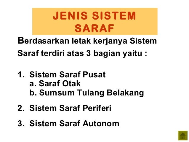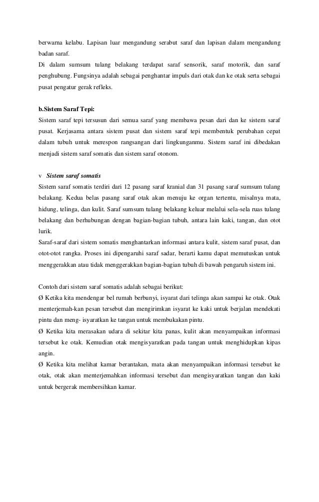 Pengertian sel saraf (neuron) : Sistem in meliputi sistem saraf pusat dan sistem saraf tepi.sistem saraf merupakan salah satu sistem saraf terdiri dari jutaan sel saraf (neuron ).fungsi sel saraf adalah mengirimkan pesan. Makalah sistem saraf/nervus kata pengantar puji dan syukur kami panjatkan sistem pencernaan pada manusia salah satu ciri makhluk hidup adalah memerlukan makanan. Otak dan sumsum tulang belakang b. Nangkring.net_ makalah yang berjudul sistem saraf dan indera merupakan makalah yang materinya khusus yaitu tentang sistem saraf dan alat indera manuisa, makalah ini disusun dengan tujuan agar.